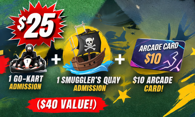Today ONLY! $25 SPECIAL: 1 Smuggler's Quay Admission, 1 Go-Kart Admission & $10 Arcade Card! $40 VALUE for ONLY $25! Available to purchase at the Arcade Counter or Smuggler's Quay Golf. Only valid today.