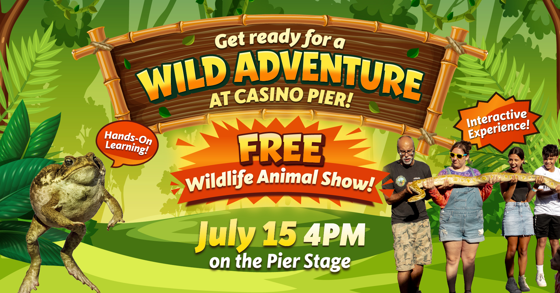 Get ready for a wild adventure at Casino Pier! 🐾🌊 Join us for an exciting FREE Wildlife Animal Show that brings you up close and personal with amazing animals from snakes to frogs to gators! This interactive experience is perfect for families and animal lovers...