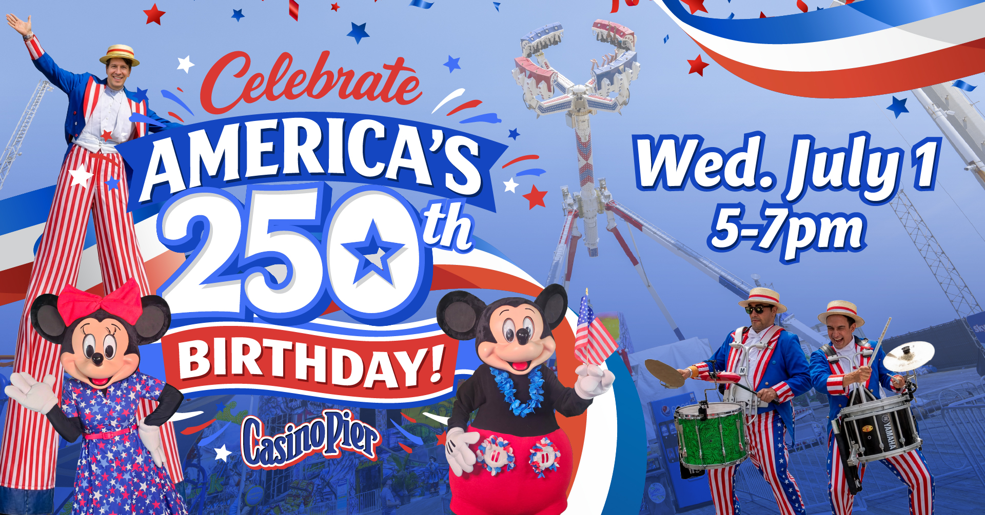 Celebrate America’s 250th Birthday with a star-spangled evening of family fun on July 1st at Casino Pier! Join us for a patriotic celebration filled with red, white, and blue excitement along the Pier. Meet lively patriotic characters roaming the pier, enjoy free face painting to...